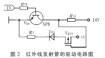 圖2是紅外線發射管的驅動電路圖。脈沖信號由R29處輸入,通過NPN型三極管,從而控制紅外發射管VD3的通斷情況,本電路中單個紅外管驅動電流選擇值約為20 mA。由于NPN型三極管驅動電流低于20 mA,需在電路中加入P-mos管增強驅動能力。R18和R29的電阻值需要匹配,若2個電阻匹配不佳,會造成驅動脈沖波形毛刺較多,使二極管導通能力減弱,導通時間延遲增大。R18盡量大,能夠減少電路功耗,R18和R29都選用10 kΩ電阻。紅外線發射管的驅動不穩定,會造成接收判斷失效,驅動電路的配置要根據實驗進行匹配。