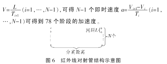 紅外線對射管構成一對紅外傳感器收發子單元。若干對紅外傳感器收發子單元構成完整的紅外線測速傳感器,其紅外線對射管分離距離和紅外傳感器收發子單元間距可以調整。如圖6所示,Ⅳ需要大于2,分離距離超過5 m。在兩對紅外線對射管之間測量物體經過的時間T,間距設置為L,可以得到后一對紅外線對射管的即時速度V: