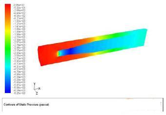 該壓差值范圍附近易于應用MEMS差壓傳感器進行測量,圖3為在該結構參數傳感裝置在流速為1m/s條件下的流場仿真情況,可以看到異徑管錐形部分內外流道的壓力變化,外流道內的壓力逐漸降低,內流道內的壓力逐漸升高,在異徑管后續直管段內外壓力穩定,形成一定壓力差。