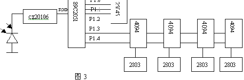 接收器部分,主要由CX20106和89C2051、顯示驅動4094、2803及數據存儲器和看門狗25045組成,用解碼芯片CX20106把38K的載波過濾后,得到一組波形,即以波特率為1200的串口數據,直接送至89C2051的RXD接收,用軟件讀取串口,輸入緩存,得到一組數據,判斷正確后,存放在非易失性的EEPROM25045中,同時直接用脈沖移位方式,送數據至4094,經2803驅動后顯示,同時用25045的看門狗定時,保證在程序失控等情況下,能正確返回而不造成錯誤接收。由于串行口方式傳輸,本身帶有奇偶校驗和起停位校驗,可以大大提高數據的可靠性,同時在數據組中還加入了累加和校驗,再次提高了可靠性,因此在實際應用中,即使在露天、太陽直射、光照很強等惡劣環境下,都能保證不會誤收數據而造成顯示錯誤。其原理圖如下: