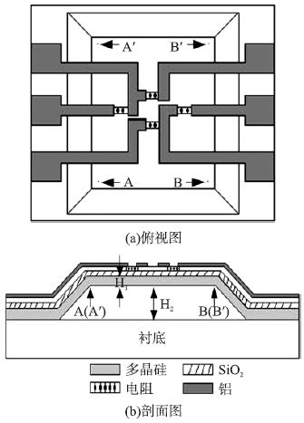 采用MEMS 技術的小量程、高靈敏壓力傳感器通常有平膜、島膜、梁膜等結構,在設計過載保護時,一般采用凸臺等方法實現,形成方法有背部刻蝕技術、硅直接鍵合( SDB) 技術、玻璃刻蝕技術等。然而這些結構的腔體尺寸較大,進一步提高靈敏度受到限制,而且降低了硅片利用率,增加了制造工藝的復雜度,提高了生產成本。目前小量程、高靈敏壓力傳感器的研究熱點集中在犧牲層結構壓力傳感器,這主要是因為犧牲層結構壓力傳感器彈性膜片很薄,厚度可做到2 μm,甚至更薄。在這樣薄的結構上,如果采用擴散硅或多晶硅薄膜作為犧牲層結構壓力傳感器的應變電阻,其厚度相對較大,對彈性膜片應力分布影響很大,不利于犧牲層結構壓力傳感器的性能優化,因此采用多晶硅納米薄膜制作應變電阻更能發揮犧牲層技術的優點。