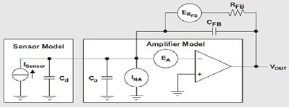 信號調節電路必須具有非低的輸入阻抗,以收集傳感器的大部分電荷輸出。因此,電荷放大器是理想的解決方案,因為只要放大器在這些信號頻率下保持高增益,其輸入便會讓傳感器信號出現虛擬接地。換句話說,如果傳感器的任何電荷想要在傳感器陽極(Cd)或者放大器輸入寄生電容(Ca)上增大,在放大器輸入端就會形成電壓。通過拉或吸取相同量的負反饋網絡電荷電流,即RFB和CFB,這種電壓便立即得到了補償。
