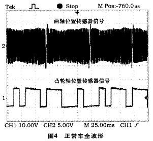 通過圖4還能看出曲軸位置傳感器波形出現(xiàn)2次才與凸輪軸位置傳感器波形重合一次起始位置,這種關系和本車曲軸轉(zhuǎn)速與凸輪軸轉(zhuǎn)速比為2:1的關系一致,也正好是1缸上止點的位置,也就是1缸點火正時的基準位置,也決定了其它3個缸的點火時刻。此信號傳輸給腳,ECU就能發(fā)出點火信號,起動發(fā)動機。否則ECU就不發(fā)出點火信號,發(fā)動機不能起動。