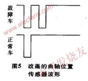有無波形可得出圖5中的2個波形,ECU只有得到圖5下圖波形才能發(fā)出點火信號起動發(fā)動機,而ECU得到圖5上的波形不能發(fā)出點火信號起動發(fā)動機,但在偶然的時刻故障位置產(chǎn)生的波形恰好達到合格的底線時,就可以起動發(fā)動機。起動后,ECU對曲軸位置傳感器波形的檢測就不是那么嚴了,因此,發(fā)動機起動后不會熄火。也就是此車故障的根本原因。