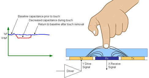 大部分的智慧型手機(jī)觸控螢?zāi)欢寄軐?duì)手指電容產(chǎn)生反應(yīng),觸控螢?zāi)粌?nèi)有許多排列整齊的感測(cè)器,會(huì)偵測(cè)出因手指移動(dòng)所導(dǎo)致的電容變化。當(dāng)你的手指觸碰到螢?zāi)粫r(shí),就會(huì)影響這些感測(cè)器的自容(Self-capacitance),以及彼此之間的互容(Mutual Capacitance)。大多數(shù)智慧型手機(jī)都是感測(cè)互容而不是自容。由于互容是反映一對(duì)感測(cè)器之間的互動(dòng)關(guān)系,因此可用來(lái)收集有關(guān)螢?zāi)簧厦總€(gè)位置的資訊(X×Y個(gè)感測(cè)點(diǎn));自容則僅能用來(lái)偵測(cè)每個(gè)感測(cè)器的反應(yīng)(X+Y個(gè)樣本),而不是每個(gè)點(diǎn)。