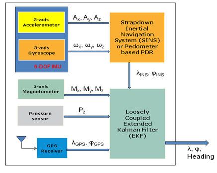 當天線沒有被遮擋時,現(xiàn)代的GPS接收器的絕對定位精度是3米到20米,這個參數(shù)不會在一段時期后發(fā)生漂移?;贛EMS傳感器的捷聯(lián)式慣性導航系統(tǒng)(SINS) 可在很短的時間內(nèi)提供精確的定位信息,但是,根據(jù)運動傳感器的性能,這種導航系統(tǒng)在使用一段時間后很快就會發(fā)生精度漂移現(xiàn)象。行人航位推算系統(tǒng)(PDR)是一個根據(jù)步長和方位計算從室內(nèi)已知初始位置開始的行走距離的相對導航系統(tǒng),雖然定位精度不會隨時間推移而發(fā)生漂移,但是需要在受磁力干擾的環(huán)境內(nèi)保持航向精度,此外,GPS需要對步長進行校準,才能達到可以接受的定位精度。