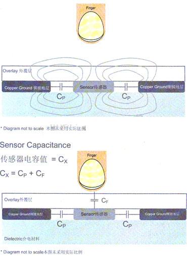 但是,這個在圖中標為CF的附加手指電容值的數量級在0.1pF至10pF。雖然一根于指的存在會導致電容發生變化,但與寄生電容相比,該變化的幅度是相當小的。而傳感器的測得電容值稱為CX。在沒有手指存在的情況下,CX基本上等于CP。而在于指存在時,CX則為CP和CF的和。