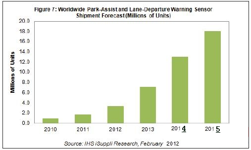 泊車輔助攝像頭與車道偏離警告攝像頭,只是將出現在自動駕駛應用中的傳感器中的兩類,未來五年預計每年都會強勁增長。這類傳感器2012年出貨量預計將達340萬個,是去年170萬個的兩倍,到2015年將達到1800萬個左右,幾乎是2010年939200個的20倍,如圖所示。
