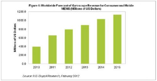據(jù)IHS iSuppli公司的MEMS市場追蹤報告,由于蘋果iPhone和iPad去年第四季度創(chuàng)出最高銷量紀錄,2011年陀螺儀成為消費與移動MEMS領(lǐng)域中的創(chuàng)收大戶。