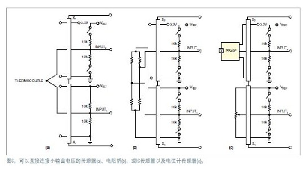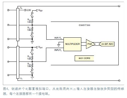 高分辨率ADC與PGA可以直接連接熱電偶(圖6)。通過切換一個通道上的上拉電阻和下拉電阻,就可以實現所需的偏置點。關掉所有內置電阻,就可以采用直接連接的橋式傳感器(如測壓元件和壓力傳感器)。這些情況下,應使ADC工作在差分模式。讓所有開關開路亦適合于采用電位器輸入或IC 傳感器的場合,如SS49E霍爾效應磁場傳感器。