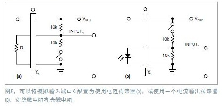模擬輸入架構能夠直接連接多種類型的傳感器。例如,可以在接地端與輸入端之間連接熱敏電阻或光敏電阻,并接通上拉電阻,構成一個分壓器;片上的ADC可以直接對這個分壓器的輸出做數字化(圖5)。這種方案還采用了比率工作方式,意味著ADC使用與分壓器驅動電壓相同的電壓基準。電流輸出傳感器也可以像光電二極管那樣連接,即直接連到接地端與輸入端之間。切換到下拉電阻,使光電流能產生一個電壓。