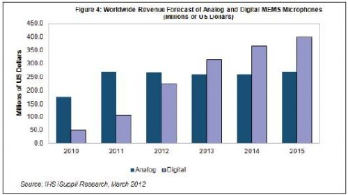據(jù)IHS公司的MEMS專(zhuān)題報(bào)告,由于具有對(duì)電磁干擾的免疫力較高和設(shè)計(jì)階段具有更大的靈活性等優(yōu)點(diǎn),越來(lái)越多地被用于手機(jī)、筆記本以及蘋(píng)果iPad等暢銷(xiāo)產(chǎn)品之中,數(shù)字MEMS麥克風(fēng)的銷(xiāo)售額明年將超過(guò)模擬產(chǎn)品。