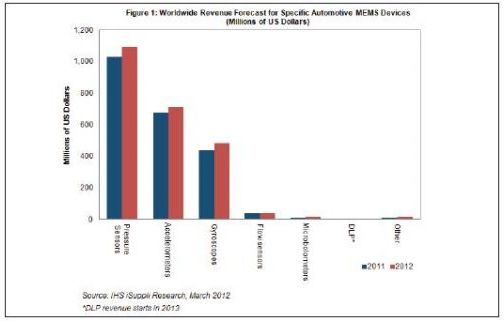 據IHS iSuppli公司的MEMS市場簡報,各國政府要求采用汽車安全傳感器的法規,2012年仍將是推動全球MEMS產業增長的重要因素,幫助汽車MEMS營業收入實現7%的健康增長。
