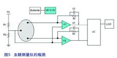 圖5所示為一個(gè)完整方案的框圖,該系統(tǒng)是由電池供電并可使用LM2623來(lái)提供3.3V的電源電壓。通過(guò)電極量度出來(lái)的電流之后會(huì)經(jīng)由一個(gè)運(yùn)算放大器被轉(zhuǎn)換成一個(gè)電壓,這個(gè)電壓再被送到微控制器處理,最后顯示在LCD熒幕上。