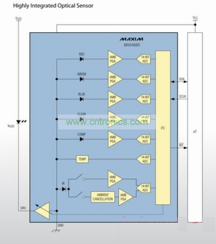 · MAX44005包含RGB傳感器、ALS傳感器、IR傳感器、IR接近檢測(cè)傳感器和溫度傳感器。