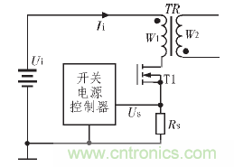 開關電源從控制方式上可分為電壓控制型和電流控制型,從隔離變壓器的驅動方式上可分為單端型和雙端型。在這些電路形式中, 許多形式的開關電源需要使用電流傳感器檢測電流,或者用于脈沖占空比的控制,或者用于電路的保護。電流控制型開關電源直接對輸入的脈沖電流進行檢測,能同時根據輸入電壓和輸出電壓的變化綜合調節脈沖占空比,具有動態響應速度快,輸入電壓的波動對輸出電壓影響小等特點。電流控制型開關電源中需要電流傳感器檢測輸入的脈沖電流, 以作為開關電源調節脈沖占空比、穩定輸出電壓的反饋信號。圖1 所示為一個電流控制型的反激式開關電源的輸入通道原理圖。圖中電阻RS在電路中的作用即是電流傳感器, 在功率開關T1導通時, 流過隔離變壓器原邊繞組W1的電流Ii將使RS上產生電壓降US,US即為向開關電源控制器反饋的輸入電流值信號。根據輸出電壓反饋信號和輸入電流值反饋信號US, 開關電源控制器將綜合調節電路的脈沖占空比,保證輸出電壓的穩定。