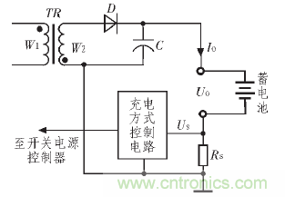 為了提高開關電源工作的可靠性,防止輸出電流過流等情況發生,許多開關電源在輸出端接入電流傳感器,檢測輸出電流的大小,一旦輸出電流超過設計標準,保護電路即采取必要措施保護開關電源的安全[3]。此外,當開關電源作為蓄電池充電器時,也需要檢測輸出電流的大小,以此了解蓄電池的充電情況,適時切換充電方式,達到提高充電效率,延長蓄電池的使用壽命的效果。圖3 為一個蓄電池充電器的輸出電流檢測原理圖, 電流檢測電阻RS將蓄電池的充電電流轉化為電壓US,反饋給充電方式控制電路,由控制電路根據充電電流的大小適時切換充電方式[4]。