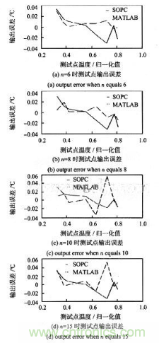 圖4是58對訓練樣本完成網絡訓練后的測試結果。由于BP神經網絡的性能受隱含層節點個數影響比較大,圖中數據是在不同隱含層節點個數的條件下得到的,并與MATLAB軟件仿真得到的結果作了比較。網絡訓練的條件:學習率為0.1,動量系數為0.9,增益為1,SOPC停止迭代的判斷條件是輸出絕對誤差累加和小于0.01,MATLAB停止迭代的判斷條件是均方根誤差小于0.0001,圖中,n代表隱含層節點個數。