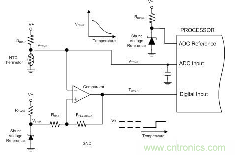 處理器的模數轉換器用于采集溫度模擬電壓(VteMP)。當溫度超出臨界值時,數字比較器的輸出端會驅動處理器的輸入端進行提示。