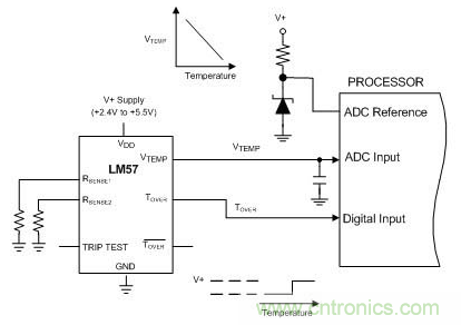 LM57完全集成(圖3),所有組成部分的輸入輸出都包含在LM57的校對流程中,因此不會產生以上所提到的誤差源。同時,系統設計員不需要累加各組成元件的誤差,從而得出總誤差。LM57能保證VTEMP模擬輸出的最大誤差為±0.7℃,TOVER警報輸出的最大誤差為±1.5℃。