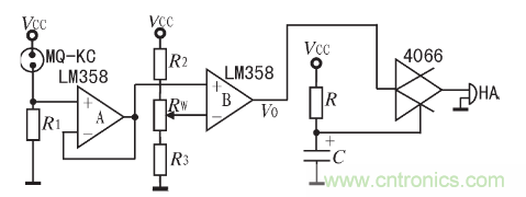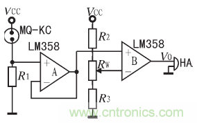 圖l中,R1是傳感器要求的負(fù)載電阻,阻值為120 Ω,Vcc為9 V電源電壓;A、B為L(zhǎng)M358雙運(yùn)放,A為跟隨器,起緩沖隔離作用,以便將R1上的電壓VR1基本上全部施加到比較器B的同相輸入端。RW為報(bào)警靈敏度調(diào)整電位器。穩(wěn)態(tài)時(shí),調(diào)整RW使得加到比較器反相輸入端的電壓V-略高于穩(wěn)態(tài)時(shí)R1上的電壓VR1這個(gè)電壓越高,報(bào)警靈敏度就越低。加電并使傳感器達(dá)到穩(wěn)態(tài)后,MQ-KC為較穩(wěn)定的固定阻值,當(dāng)Vcc不變時(shí),VR1基本為一固定值,保持不變。當(dāng)有可燃性氣體泄露時(shí),傳感器接觸到可燃?xì)猓蛊潆妼?dǎo)率上升,電阻下降,使VR1上升,當(dāng)VR1高于V-時(shí),比較器輸出一個(gè)大于7 V的電壓,從而使蜂鳴器HA發(fā)出滴、滴的報(bào)警聲。若用該電壓控制一個(gè)繼電器,即可實(shí)現(xiàn)控制功能。為了提高抗干擾能力,可分別在R1和B的V-端并聯(lián)一只濾波電容。