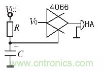 圖1所示的基本報(bào)警電路的不足:一開始加電時(shí),傳感器尚未達(dá)到穩(wěn)態(tài),其電阻值較小,VR1較大,導(dǎo)致蜂鳴器HA誤報(bào)警。為了解決這一問題,采用一個(gè)數(shù)字信號(hào)控制的模擬開關(guān),其控制信號(hào)采用簡(jiǎn)單的電容充電延時(shí)電路,原理圖如圖2所示。圖1中比較器B的輸出V0加到模擬開關(guān)4066的輸入端,開關(guān)的輸出端接蜂鳴器HA。初始加電時(shí),電容C上的電壓VC為0,4066不導(dǎo)通,無論V0值為多高,HA都不會(huì)報(bào)警。隨著電容充電,VC不斷升高,當(dāng)達(dá)到4066的控制門限閾值時(shí),4066才導(dǎo)通,即能進(jìn)入報(bào)警狀態(tài)。電容充電使其電壓達(dá)到4066的控制門限閾值時(shí)間即為延時(shí)時(shí)間。電容C和電阻R的取值可根據(jù)延時(shí)要求確定。為可靠起見,取RC=1/2T,T為傳感器初始穩(wěn)定時(shí)間。本裝置取R=l MΩ,C=100μF,即能實(shí)現(xiàn)可靠的延時(shí)。