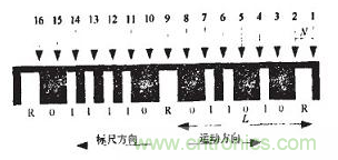 可知,要識別一個完粘的碼區(qū)必須設(shè)置9個霍爾元件,但為了能隨時識別出一個完整碼區(qū),必須設(shè)置16個霍爾元件。以圖2所示時刻位置來說明其丁作過程,其中箭頭表示霍爾元件,數(shù)字為其編號。