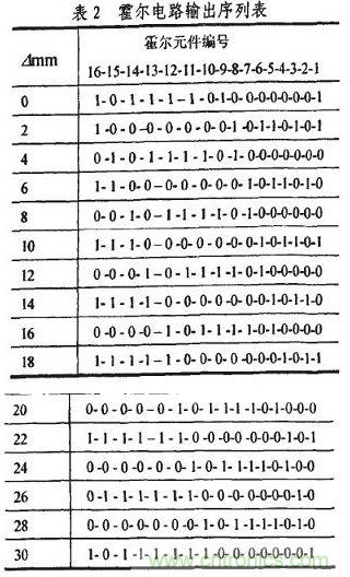 霍爾電路的工作原理是,在外磁場的作用下,當(dāng)磁感應(yīng)強(qiáng)度B超過導(dǎo)通工作點(diǎn)時,霍爾電路輸出管導(dǎo)通,輸出低電-半:若曰值低于釋放點(diǎn)時,輸出管截止,輸出高電半。因此在“凸槽”時鋼質(zhì)活塞桿被磁化,磁感應(yīng)強(qiáng)度曰增加,霍爾電路導(dǎo)通,輸出低電平,用“1”表示;在“凹槽”時輸出高電平,用“0”表示。以第1個霍爾元件為測量基準(zhǔn),從圖2所示時刻起,位移暈旃次變化b=2mm時,一個碼區(qū)行程內(nèi)霍爾電路輸出的二進(jìn)制序列如表2所示。分析可知,序列的標(biāo)識碼為l 0000000 1,其前面或后面6位序列數(shù)分別為相鄰的兩個數(shù)值碼,這使它具有很強(qiáng)的容錯能力。標(biāo)識碼每隔一個霍爾元件間距N在低位部分右移一位。值得注意的是,標(biāo)識碼前面的數(shù)值碼代表磁性標(biāo)尺當(dāng)前檢測位置下一個碼區(qū)的值。