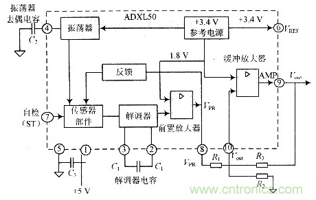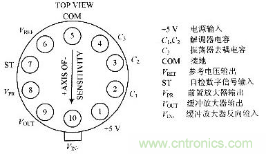 ADXL50是一個完整的加速度測量系統,它將一個傳感器部件和完成加速度測量有關的電路,包括振蕩器、解調器、前置放大器、緩沖放大器、參考電源及溫度補償電路等。全部集成在一片硅晶片上。芯片封裝于10腳T0100管殼內,這10腳的定義如圖2所示。