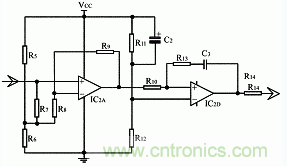 由D1、R15~R18、C6及IC 2C組成,由R18引入正反饋。當(dāng)前級(jí)信號(hào)頻率低于一定值F1時(shí),IC 2C的8腳輸出低電平;當(dāng)前級(jí)信號(hào)頻率高于一定值F2時(shí),IC 2C的8腳輸出高電平。臨界過(guò)渡區(qū)頻率范圍FW=F2-F1,適當(dāng)?shù)腇W可以有效防止檢測(cè)信號(hào)臨界過(guò)渡區(qū)的輸出振蕩,使得檢測(cè)動(dòng)作可靠。