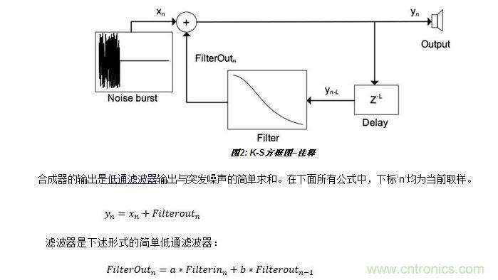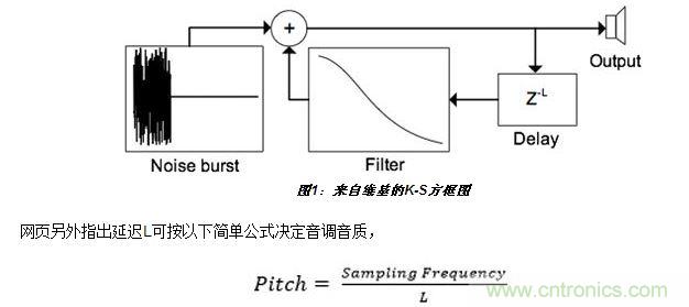 數(shù)字聲音合成技術(shù)總讓我這個(gè)業(yè)余愛好者感到著迷。一個(gè)有關(guān)Karplus-Strong吉他合成技術(shù)的維基網(wǎng)頁更加激發(fā)了我的興趣。它吸引我的地方是這種合成器設(shè)計(jì)非常簡單。下面是來自維基網(wǎng)頁的圖形(圖1):
