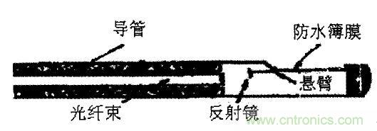 1、壓力測(cè)量。目前臨床上應(yīng)用的壓力傳感器主要用來測(cè)量血管內(nèi)的血壓、顱內(nèi)壓、心內(nèi)壓、膀胱和尿道壓力等。用來測(cè)量血壓的壓力傳感器示意見圖3。其中對(duì)壓力敏感的部分是在探針導(dǎo)管末端側(cè)壁上的一塊防水薄膜,一面帶有懸臂的微型反射鏡與薄膜相連,反射鏡對(duì)面是一束光纖,用來傳遞入射光到反射鏡,同時(shí)也將反射光傳送出來。當(dāng)薄膜上有壓力作用時(shí)。薄膜發(fā)生形變且能帶動(dòng)懸臂使反射鏡角度發(fā)生改變,從光纖傳來的光束照射到反光鏡上,再反射到光纖的端點(diǎn)。由于反射光的方向隨反射鏡角度的變化而改變,因此光纖接收到的反射光的強(qiáng)度也隨之變化。這一變化通過光纖傳到另一端的光電探測(cè)器變成電信號(hào),這樣通過電壓的變化便可知探針處的壓力大小。