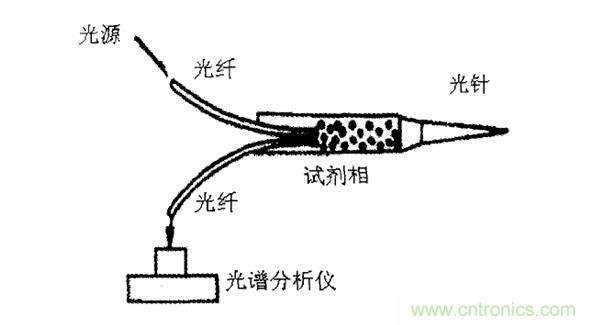 用來測(cè)定活體組織和血液值pH光纖光譜傳感器示意圖,如圖5所示。其工作原理是利用發(fā)射光、透射光的強(qiáng)度隨波長(zhǎng)的分布光譜來進(jìn)行測(cè)量。這種傳感器將兩根光纖插入可透過離子的纖維素膜盒中.膜盒內(nèi)裝有試劑,當(dāng)把針頭插入組織或血管后,體液滲入試劑,導(dǎo)致試劑吸收某種波長(zhǎng)的光。用光譜分析儀測(cè)出此種變化,即可求得血液或組織的pH值。