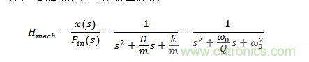 其中Fin(s)是輸入的力(在使用陀螺儀時是科里奧利力,在使用加速度計時是由于輸入加速產生的力)。x(s)是傳感器質量塊對應輸入力的位移。m是質量塊的質量,D是阻尼系數,k是彈簧常數(剛度)。