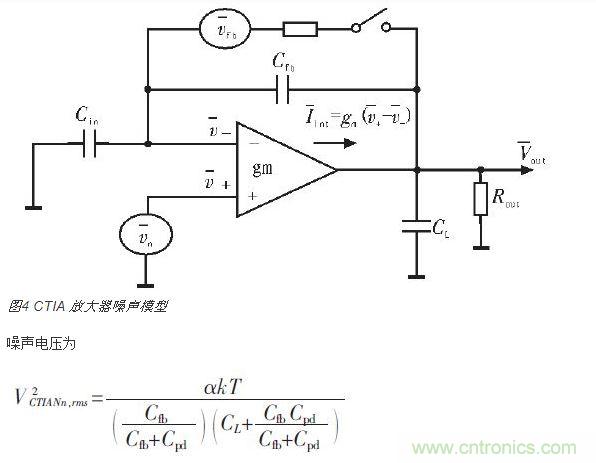 CTIA 讀出噪聲與輸入端電容Cin=Cpd、反饋電容Cfb,以及負(fù)載電容CL的設(shè)計(jì)均有關(guān),其小信號噪聲模型如圖4 所示。