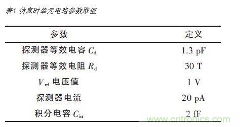 由于C1和C2的作用, 使得Cf在CTIA 反饋回路中的有效值減少,其有效值為:Cfb= ( C2Cf)/(Cf +C1+C2),這樣Cf可以取相對較大的值,避免了使用小電容,因?yàn)樾‰娙菰诠に嚿陷^難實(shí)現(xiàn),且誤差較大。在本電路中,Cf=20 fF,C2=18 fF,C1=150 fF,則Cfb=2 fF。