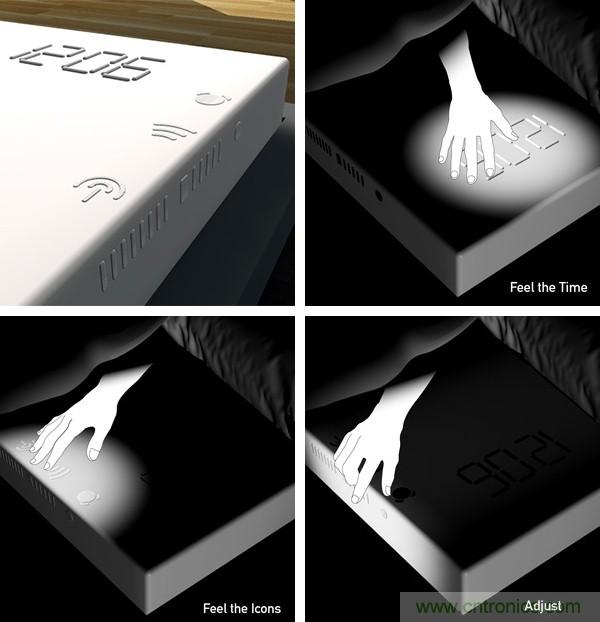這個有趣的想法是將鬧鐘設計在床上,可以時間顯示、有鬧鐘開關、音量調節、功能設置等凸起按鈕,它們都被隱藏在床單下面,不必睜開雙眼,通過觸摸,我們就可以知曉和調節時間。這些模塊是采用一種仿生材料制成的,這種材料又被稱為人工肌肉。它通過收縮或者膨脹來改變外形,從而達到變幻時間顯示數字的效果。
