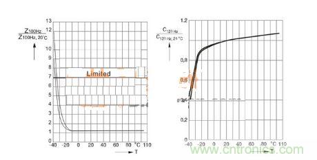 在鋁電解高壓電容器的正常運行過程中,其本身的電解液導電性,將會隨著環境溫度的降低而降低,從而會導致電解液阻抗的增加,阻抗和損耗角正切也會因此而增大。在絕大多數應用中,相應增加僅允許到某最大值。在這里需要強調的一點是,低于上述溫度限值的工作并不會損壞高壓電容,僅僅只是會影響其使用壽命,尤其是當紋波電流流經器件時,由于增加ESR而產生的熱量耗散會提高電容器溫度,使其遠大于環境溫度,使電容可維持設備運行。下圖所示為下限類別溫度為-25℃電容器的阻抗和電容典型值。