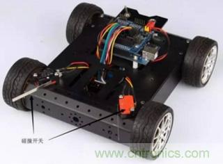 在機器人比賽中,碰撞開關經常被用在碰撞壁障小車上(見圖3)。小車前端的碰撞開關在碰撞到障礙物時就會給控制器反饋一個信號,告訴控制器前方左側或右側有障礙物,程序再控制小車轉彎避開障礙物。