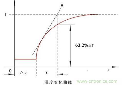 實踐證明熱電偶、熱電阻、雙金屬溫度計當被測溫度突然發生變化時,其輸出會延遲一段時間,這段延遲時間△τ一般叫做純滯后或純時延。在延遲△τ后,會以近似于指數曲線的規律變化(如下圖所示),如忽略△τ,并以介質溫度變化做計時起點,則上述曲線符合T=△T(1-e-t/τ),此式中T為溫度;△T為溫度變化;t為時間;τ為時間常數。時間常數及時反應曲線起點的切線與平衡溫度交點A所對應的時間,也就是輸出變化63.2%△T所需要的時間。