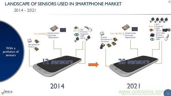 根據有關機構的預計,2014年智能手機內的平均傳感器數量為12顆,而到2021年這一數量將增加到20顆;除了一些必要的同類傳感器數量會增多之外,也有不少針對專業領域的機型會考慮搭載一些普通消費者無法想象的傳感器。