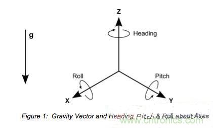 ● 加速度計不能建立絕對或相對的航向。當(dāng)安裝在一個固定的設(shè)備中時,3軸加速度計可以測量單個加速度軸上的加速度。如圖1所示,當(dāng)處于固定狀態(tài)時,可以根據(jù)垂直重力加速度矢量計算出滾動和傾斜角度。然而,航向是圍繞Z軸得到的,無法從重力矢量計算出航向。因此,加速度計不能提供航向。