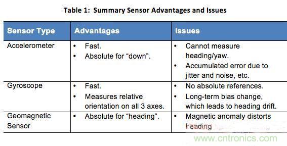 如前所述,加速度計、陀螺儀和地磁傳感器每個都有各自的優(yōu)缺點。下表1總結(jié)了每種傳感器在運動跟蹤方面的主要優(yōu)勢和問題。