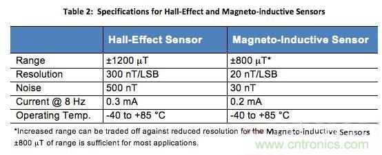 在今天的消費電子產(chǎn)品中使用最廣泛的地磁傳感器是霍爾效應(yīng)傳感器。這種傳感器主導(dǎo)消費市場的原因是體積小、價格低并且節(jié)省功耗。但這種傳感器同樣有噪聲,很容易受其它磁場干擾,這些問題如果不校正將限制其向陀螺儀提供正確航向數(shù)據(jù)的能力。然而,如果能夠接受稍大尺寸的永磁感應(yīng)式地磁傳感器,就可以在不犧牲成本或功耗的情況下獲得顯著改進的噪聲與分辨率性能。表2顯示了霍爾效應(yīng)和永磁感應(yīng)傳感器的規(guī)格。注意,永磁感應(yīng)傳感器可以提供明顯更低的噪聲和更高的分辨率。