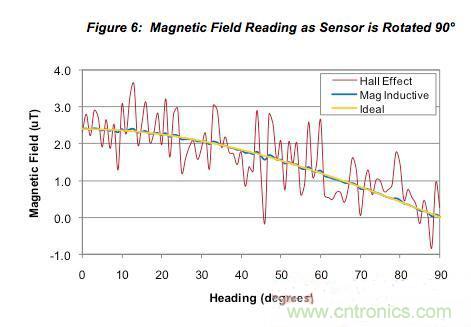 下圖顯示了地磁傳感器在磁場強度為2.4mT數(shù)量級的固定位置旋轉(zhuǎn)時輸出的磁場讀數(shù)。在圖5中,傳感器旋轉(zhuǎn)了整整360°,而在圖6中,傳感器從0°旋轉(zhuǎn)到90°。這兩張圖都繪出了霍爾效應(yīng)傳感器、永磁感應(yīng)傳感器和理想傳感器的試驗數(shù)據(jù)。