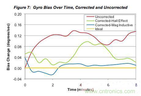前面的圖3給出了隨時間變化的陀螺儀零偏,它代表了長期航向漂移的根本原因。在9軸傳感器融合系統(tǒng)中,加速度計和磁力傳感器建立了一個長期的基準(zhǔn)用于校正零偏變化。但磁力傳感器讀數(shù)中的噪聲以及磁力傳感器類型對零偏校正的效果有顯著的影響。圖7再次顯示了隨時間改變的零偏變化,但這次畫出了未校正的、用霍爾效應(yīng)傳感器校正的、用永磁感應(yīng)傳感器校正的和理想輸出的圖形。值得注意的是,所用的傳感器融合算法對兩種傳感器來說是相同的。