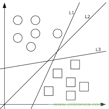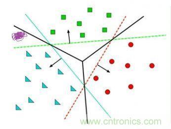 給定隨機數作為a,c,b的初始值,我們通過訓練數據不斷的優化參數a,b,c,把不合適的L1、L3等分類函數逐漸訓練成L2,這樣的L2去面對泛化的測試數據就可能獲得更好的效果。然而如果有多個類別,就需要多條分類直線才能分出,如下圖所示: