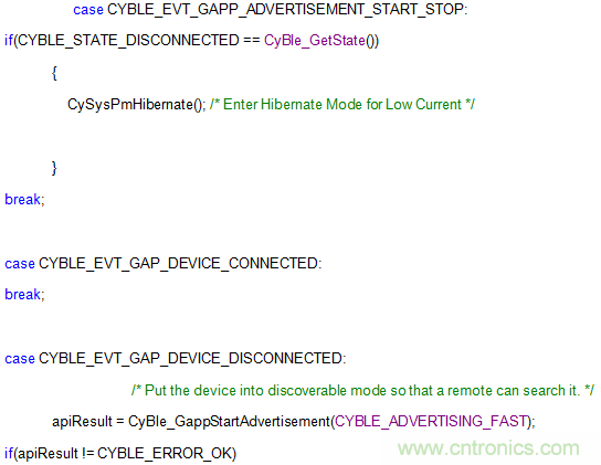 BLE中的一切都作為“活動”處理。BLE堆棧提供處理這些事件的“定義”。以下代碼片段展示了其中一部分活動的運(yùn)行。