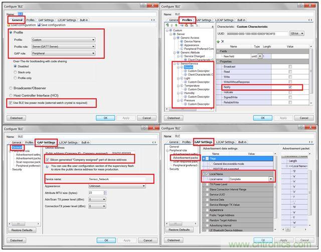 BLE組件在其GAP層中被配置為從設(shè)備。這使任何BLE設(shè)備(如BLE手機(jī))都可以掃描此設(shè)備,在BLE從設(shè)備包含其名稱廣播時被BLE手機(jī)連接。此外,在其GATT層中,BLE設(shè)備被配置為具有自定義配置文件的GATT服務(wù)器。下面將討論BLE低功耗特性在該組件內(nèi)啟用。名為“Sensor Service”的單一服務(wù)具有5種不同的特性,用于采集每個傳感器的數(shù)據(jù)。每個特性都具有通知功能,可以將傳感器數(shù)據(jù)作為通知發(fā)送。