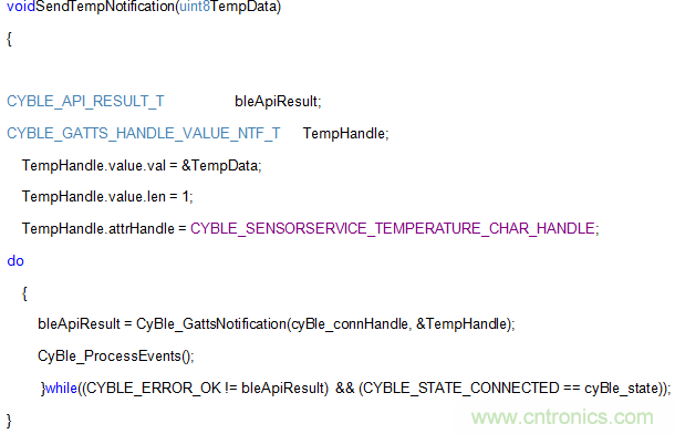 一旦兩個設(shè)備實現(xiàn)連接,就能使用連接間隔不同的通知發(fā)送數(shù)據(jù)。應(yīng)用程序接口“CyBle_ProcessEvents()”應(yīng)置于while(1)循環(huán)中,且必須在每個連接間隔中至少調(diào)用一次。我們也可以調(diào)用在同一while循環(huán)中將數(shù)據(jù)作為通知發(fā)送的函數(shù)。以下函數(shù)可用于將溫度數(shù)據(jù)的一個字節(jié)作為通知發(fā)送。這也適用于其他傳感器特性。